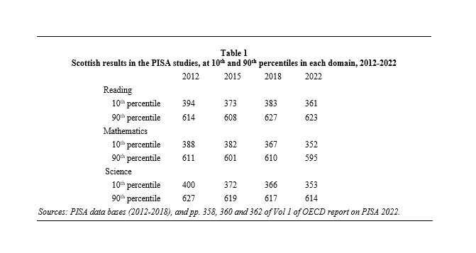 Table 1: Scottish results in the PISA studies, at 10th and 90th percentiles in each domain, 2012-2022